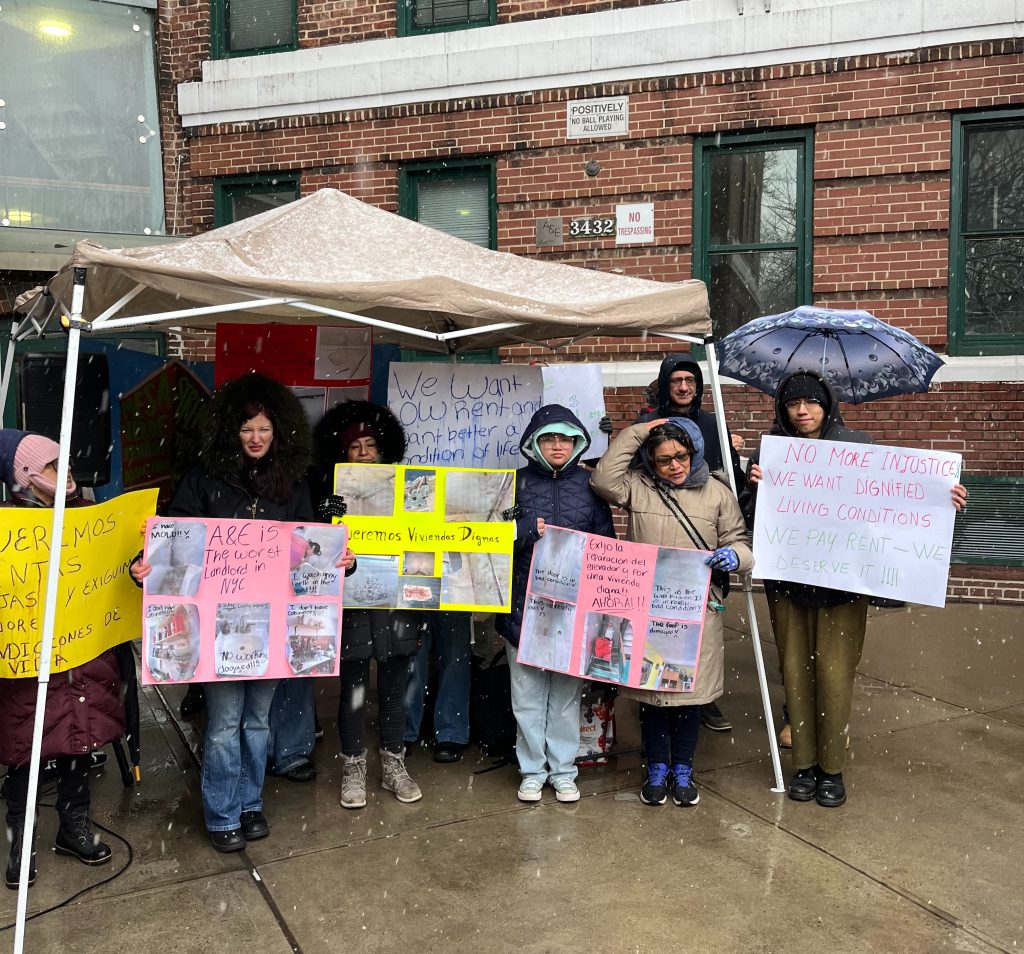 At the press conference, held February 22 amidst a once-in-a-decade blizzard, tenants described unlivable conditions and demanded that A&E address the hundreds of HPD violations across La Mesa Verde’s six buildings.