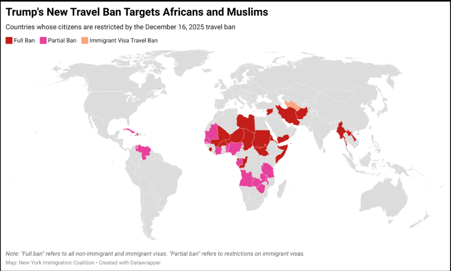 Critics say the policy revives one of the most controversial immigration measures of Trump’s first term and expands it to one of the largest race- and religion-concentrated mobility restrictions in modern U.S. history. The affected countries represent more than 1 billion people, roughly one-eighth of the global population.