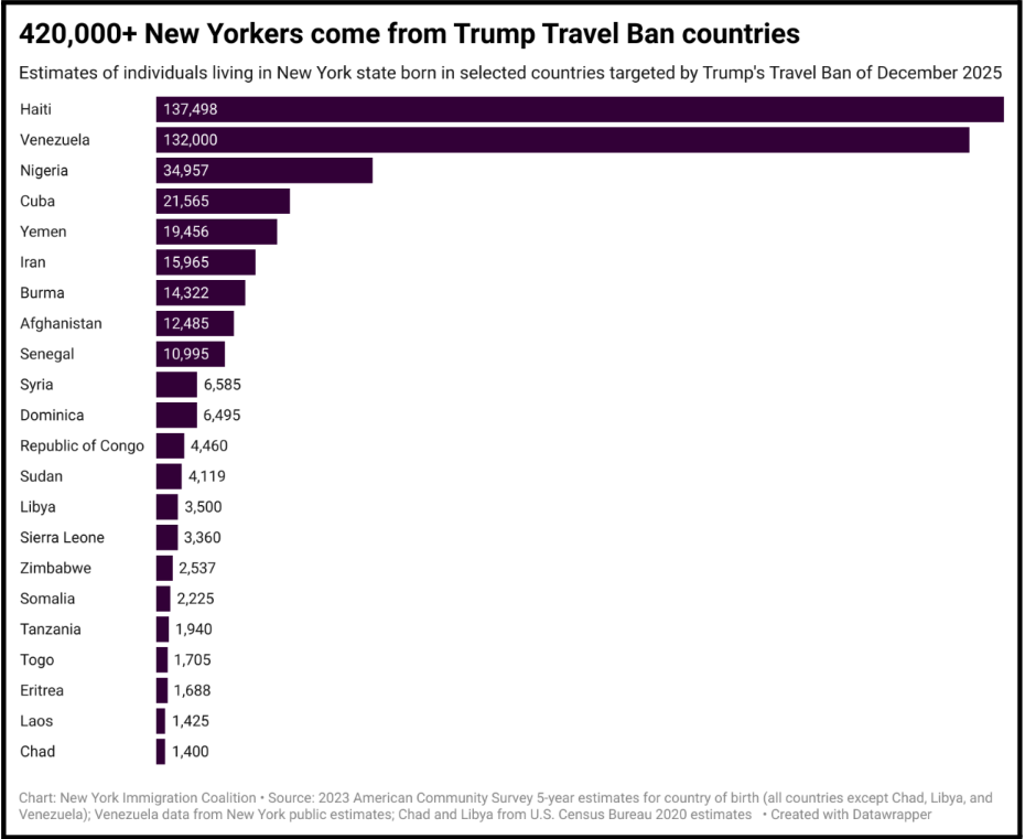 Advocates estimate that about 420,000 New Yorkers come from countries now subject to the ban, according to the New York Immigration Coalition. Many live in Queens neighborhoods such as Astoria, Jamaica, Woodside and Ozone Park, where families often rely on travel for work, education and reunification.